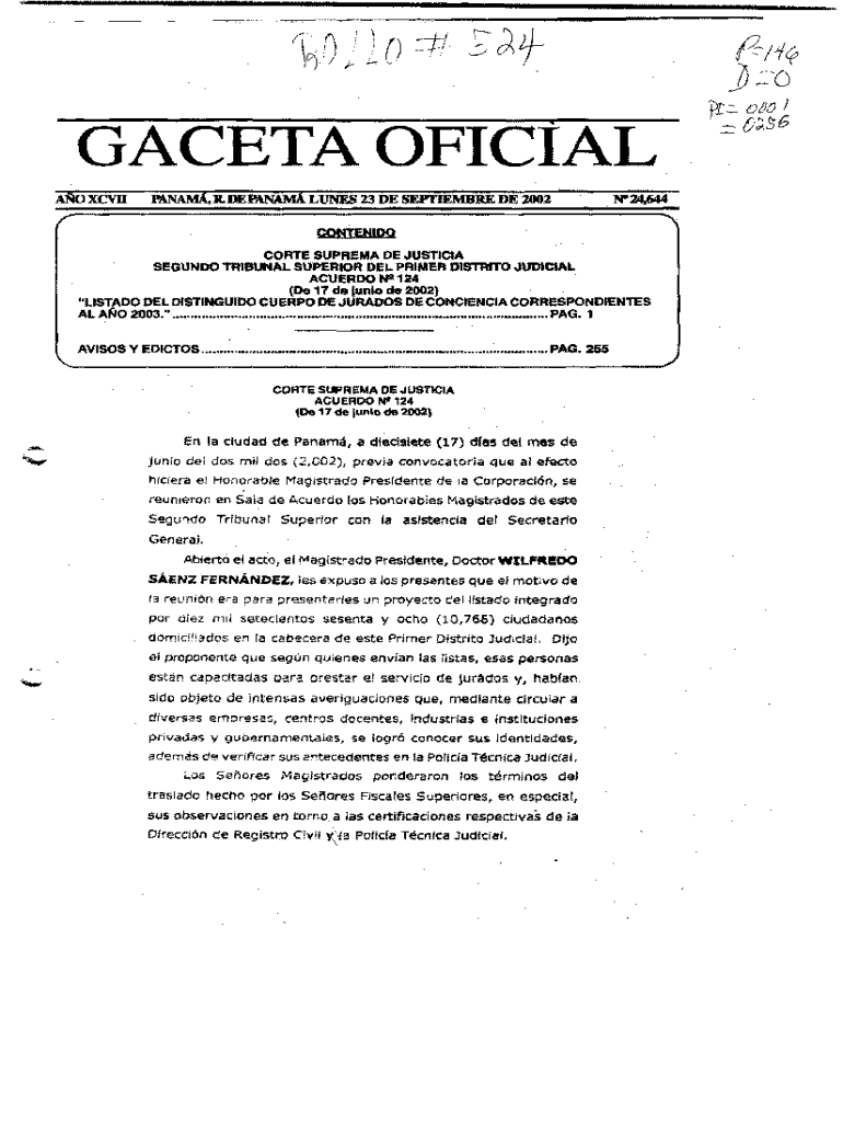 (.CJ f×Hi) Fol ;)L7. .GACETAOFICiAL AAA xcvnPMIR.DEP AM LINES 23 DE SEPTEMBER DE 200l. CONTENIDOCORTE SUPREME OE JUSTICE SEGUNDO TRIBUNAL SUPERIOR OIL. PRIMER DISTRICT JUDICIAL ACTED ... 124. (DE