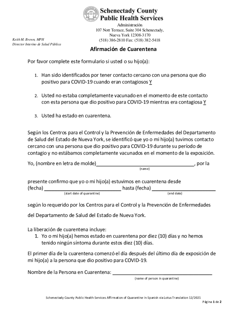 Get the free Afirmacin de Cuarentena - Schenectady County