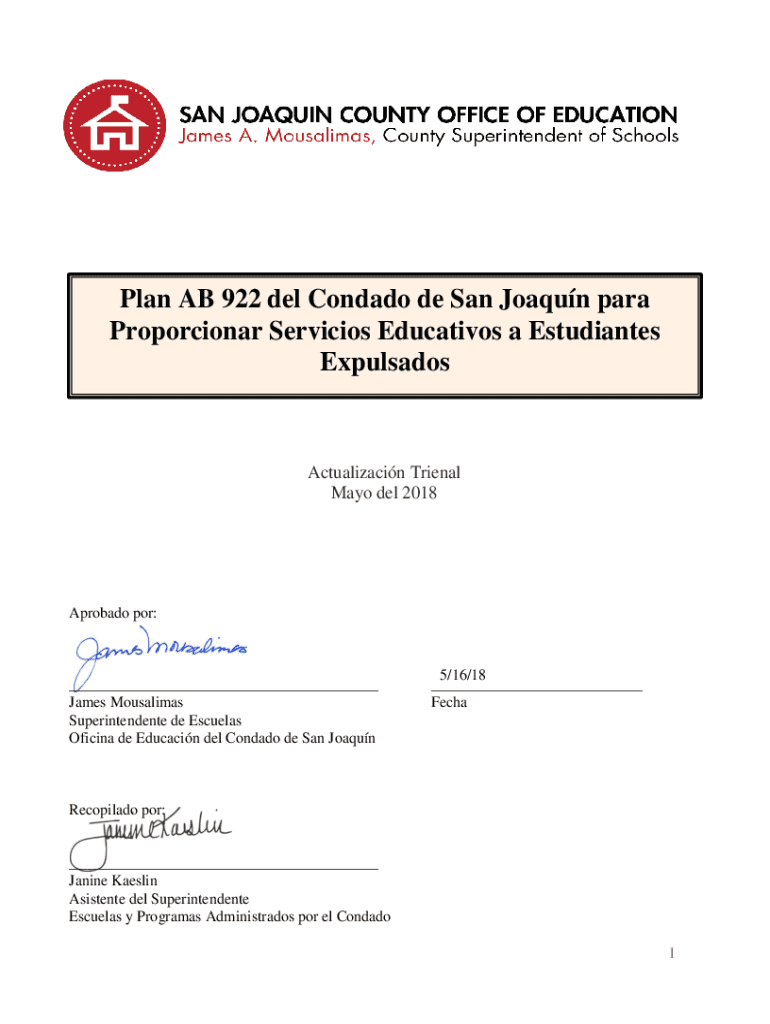 Plan AB 922 Del Condado de San Joaquin para Proportional Services Education an Estudiantes ExpulsadosActualizacin Train Mayo Del 2018Aprobado POR:___ James Muslims Superintendent de Escuelas Official