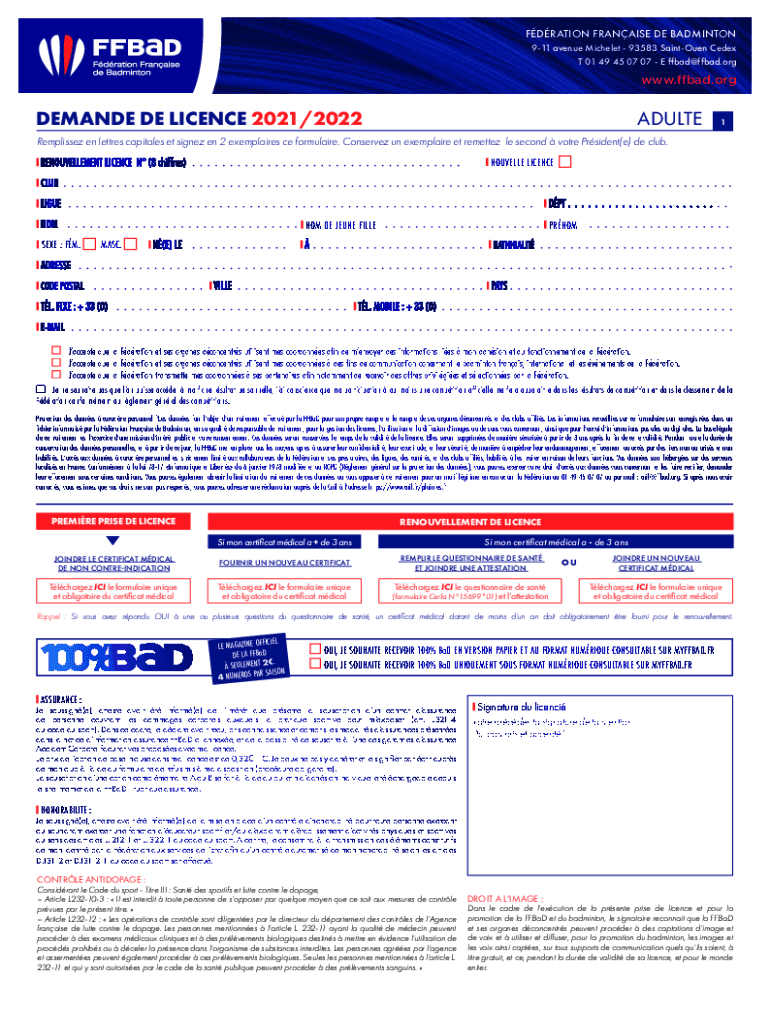 Bulletin d\'adhesion pour la Saigon 20212022 Adhesion AU Badminton Club Saint Madras pour UN Montana DE ......... Not, Prom : .....................................................................................................................................................