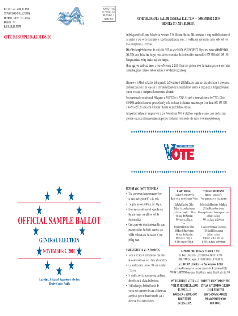 LUCRETIA A. STRICKLAND SUPERVISOR OF ELECTIONS HENDRY COUNTY, FLORIDA PO BOX 174 LaBelle, FL 33975NONPROFIT ORG US POSTAGE PAID MELBOURNE, FL PERMIT #724OFFICIAL SAMPLE BALLOT INSIDEOFFICIAL SAMPLE