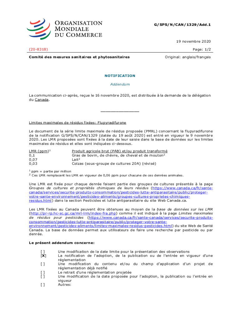 G×SPS×N/CAN×1329/Add.119 November 2020 ×208318)Page: 1×2Comit DES measures solitaires et phytosanitairesOriginal: angles×franaisNOTIFICATION Addendum La communication cars, reuse LE 16 November
