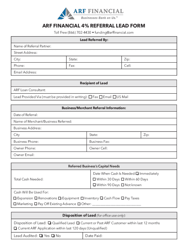 ARF FINANCIAL 4% REFERRAL LEAD FORM Toll Free (866× 7024430 funding×arfnancial.com Lead Referred By: Name of Referral Partner: Street Address: City:State:Zip:Phone:Fax:Cell:Email Address: Recipient
