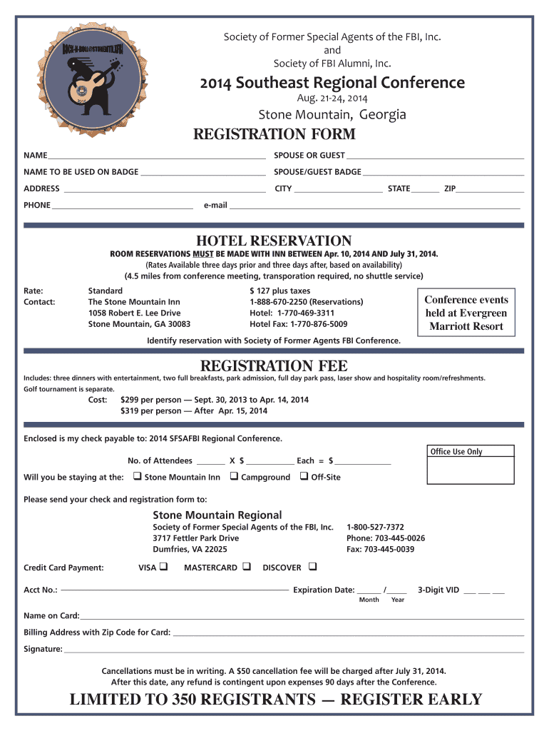 Society of Former Special Agents of the FBI, Inc. and Society of FBI Alumni, Inc. 2014 Southeast Regional Conference Aug. 21-24, 2014 Stone Mountain, Georgia REGISTRATION FORM NAME SPOUSE?OR?GUEST