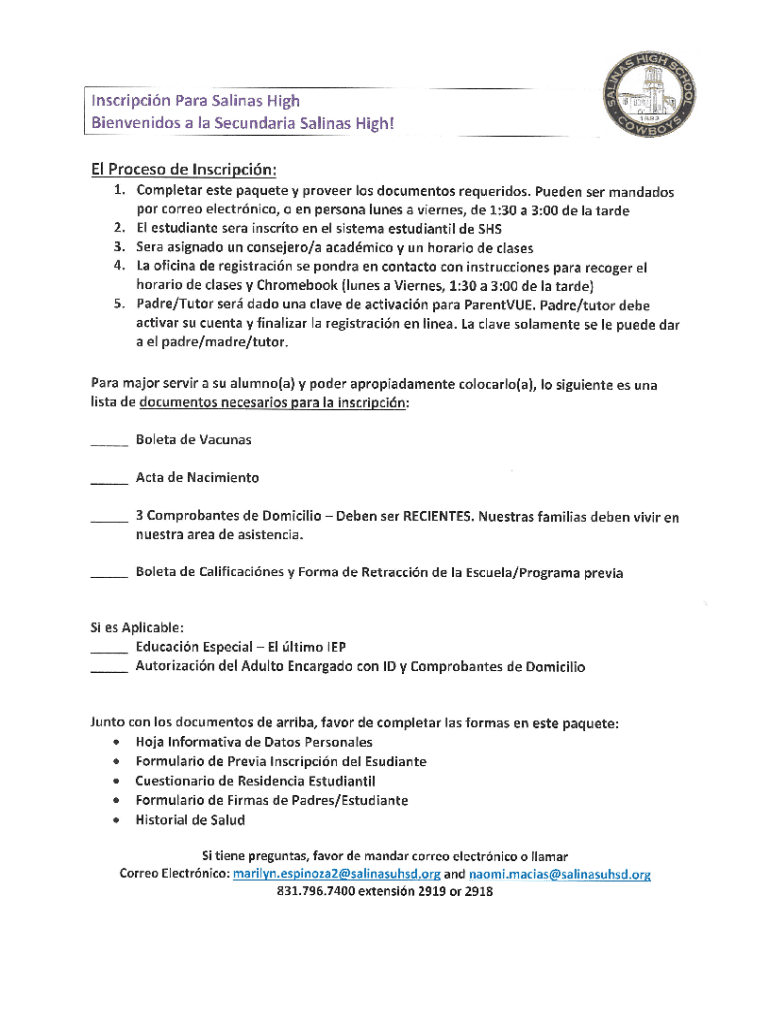 Inscription Para Salinas High Bienvenidos an Ia Secondary Salinas High! El Process DE inscription: 1. Completer ester Paiute y pro veer Los documents requeridos. Queen SER mandates POR core electric,