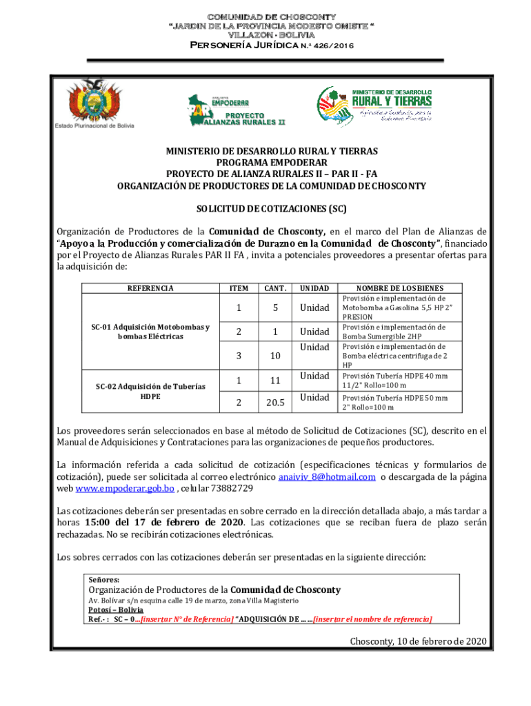 COMMUNIZED DE CHOCOLATY HARDIN DE LA PROVINCIAL MODESTO OMI STE VILLAIN BOLIVIAPersonera Juridical N. 426×2016MINISTERIO DE DESARROLLO RURAL Y SIERRAS PROGRAM EMPEROR PROJECT DE ALBANIA RURAL ES