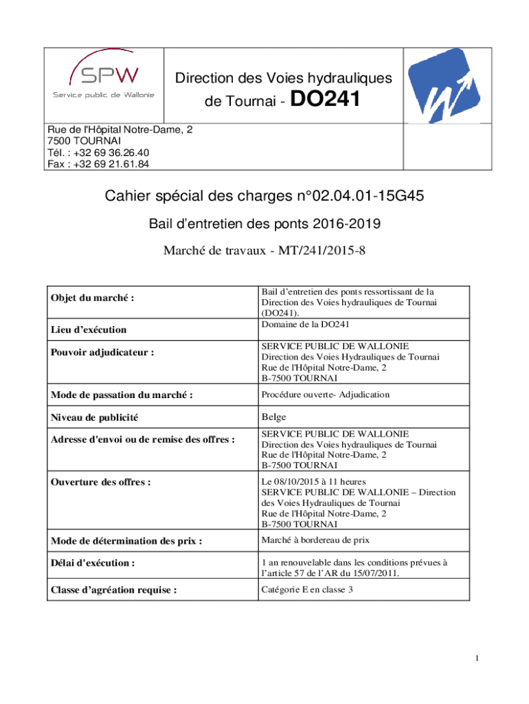 Direction DES Votes hydraulics DE Tourney DO241 Rue de l\'Hp ital Notre-Dame, 2 7500 JOURNAL Tl. +32 69 36.26.40 Fax : +32 69 21.61.84Cahier social DES charges n02.04.0115G45 Bail dentition DES points