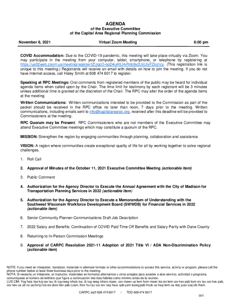 AGENDA of the Executive Committee of the Capital Area Regional Planning Commission November 8, 2021Virtual Zoom Meeting6:00 pm COVID-19 Accommodation: Due to the COVID-19 pandemic, this meeting will