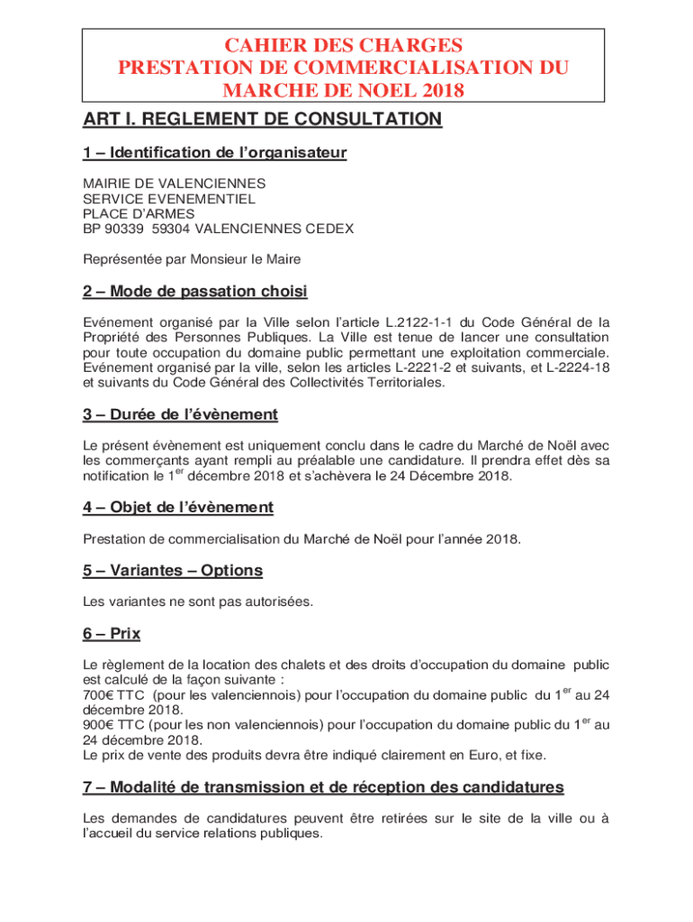 CASHIER DES CHARGES PRESTATION DE Commercialization DU MARCH DE NOEL 2018 ART I. REGALEMENT DE CONSULTATION 1 Identification de lorganisateur MARIE DE VALENTINES SERVICE EVENEMENTIEL PLACE DARES BP