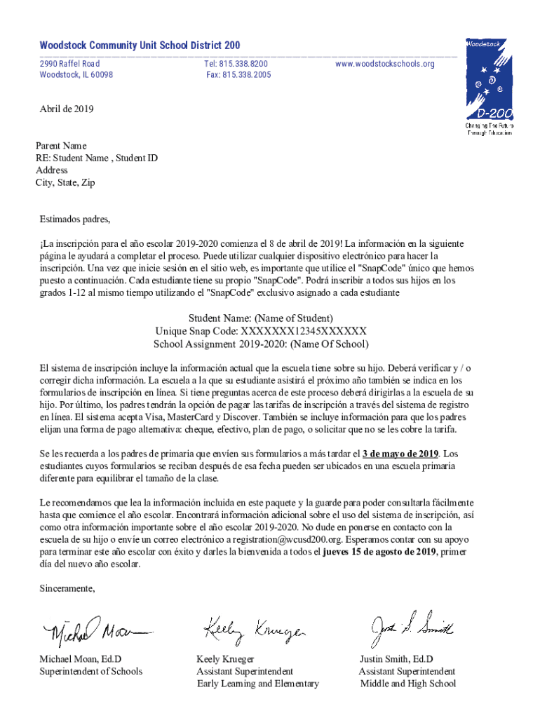 Woodstock Community Unit School District 200___2990 Rafael Road Woodstock, IL 60098Tel: 815.338.8200 Fax: 815.338.2005www.woodstockschools.organic de 2019Parent Name RE: Student Name, Student ID Address