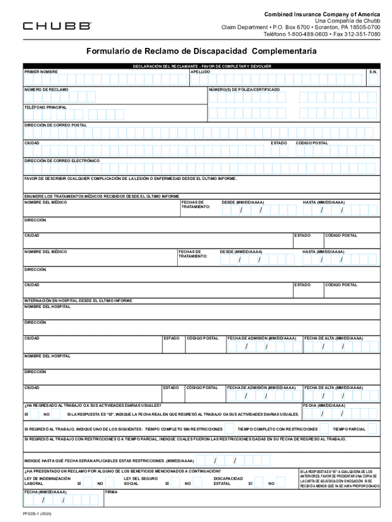 Combined Insurance Company of America RNA Compaq de Chubb Claim Department P.O. Box 6700 Scranton, PA 185050700 Teflon 18004880603 Fax 3123517080Formulario de Reclaim de Discapacidad Complement aria
