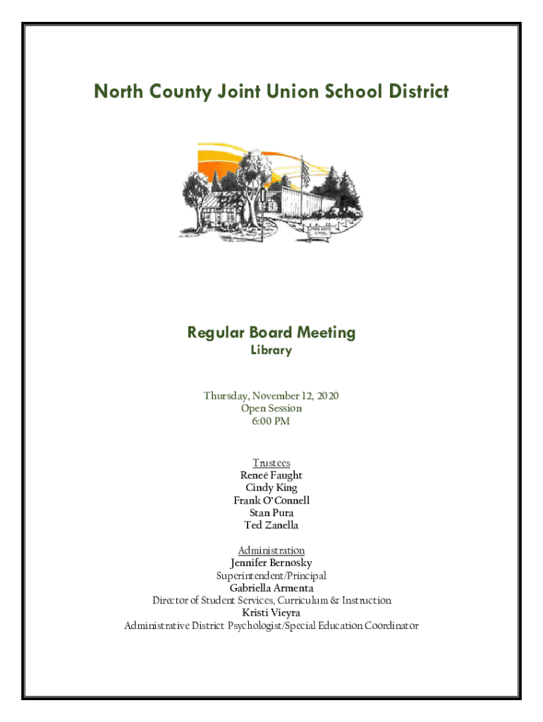 North County Joint Union School DistrictRegular Board Meeting Library Thursday, November 12, 2020, Open Session 6:00 Trustees Rene Caught Cindy King Frank O'Connell Stan Pure Ted Vanilla Administration