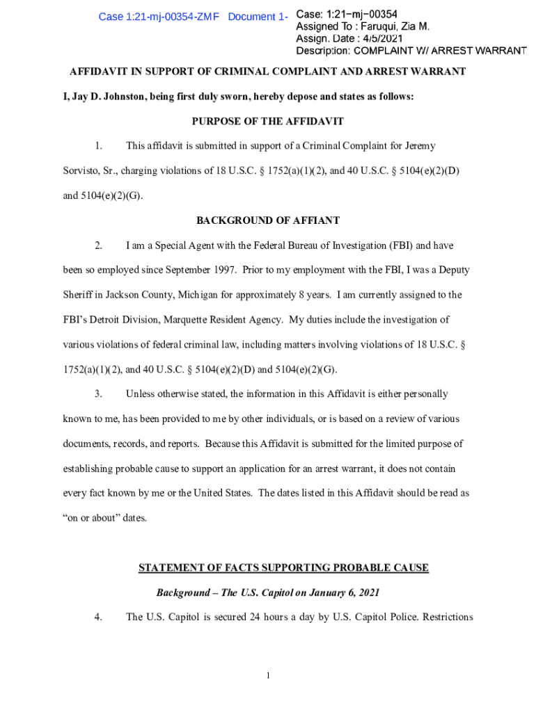 Case 1:21mj00354ZMF Document 11 Filed 04×05/21-Page 1 of 24AFFIDAVIT IN SUPPORT OF CRIMINAL COMPLAINT AND ARREST WARRANT I, Jay D. Johnston, being first duly sworn, hereby depose and states as follows: