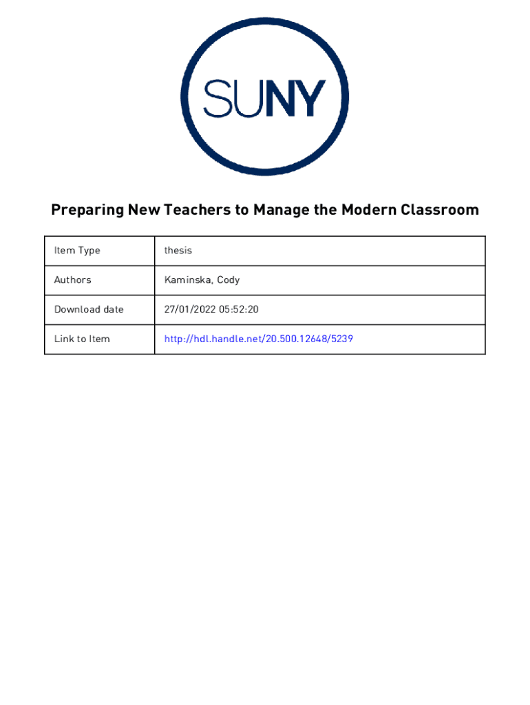Preparing New Teachers to Manage the Modern Classroom Item TypethesisAuthorsKaminska, CodyDownload date27×01×2022 05:52:20Link to Itemhttp://HDL.handle.net×20.500.12648/5239PREPARING NEW TEACHERS