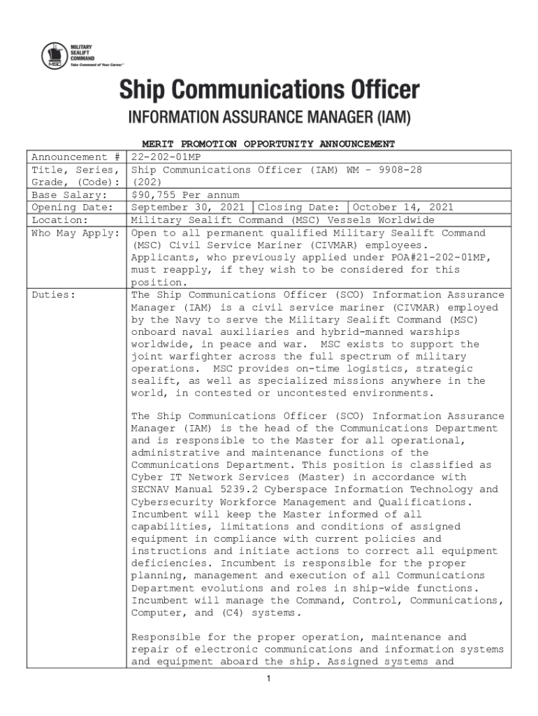 Announcement # Title, Series, Grade, (Code): Base Salary: Opening Date: Location: Who May Apply:Duties:MERIT PROMOTION OPPORTUNITY ANNOUNCEMENT 2220201MP Ship Communications Officer (IAM) WM 990828