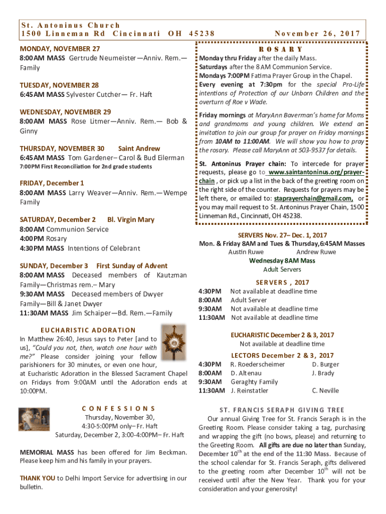 St. Antoninus Church 1500 Lineman Rd CincinnatiOHMONDAY, NOVEMBER 27 8:00AM MASS Gertrude NeumeisterAnniv. Rem. Family TUESDAY, NOVEMBER 28 6:45AM MASS Sylvester Catcher Fr. Haft WEDNESDAY, NOVEMBER