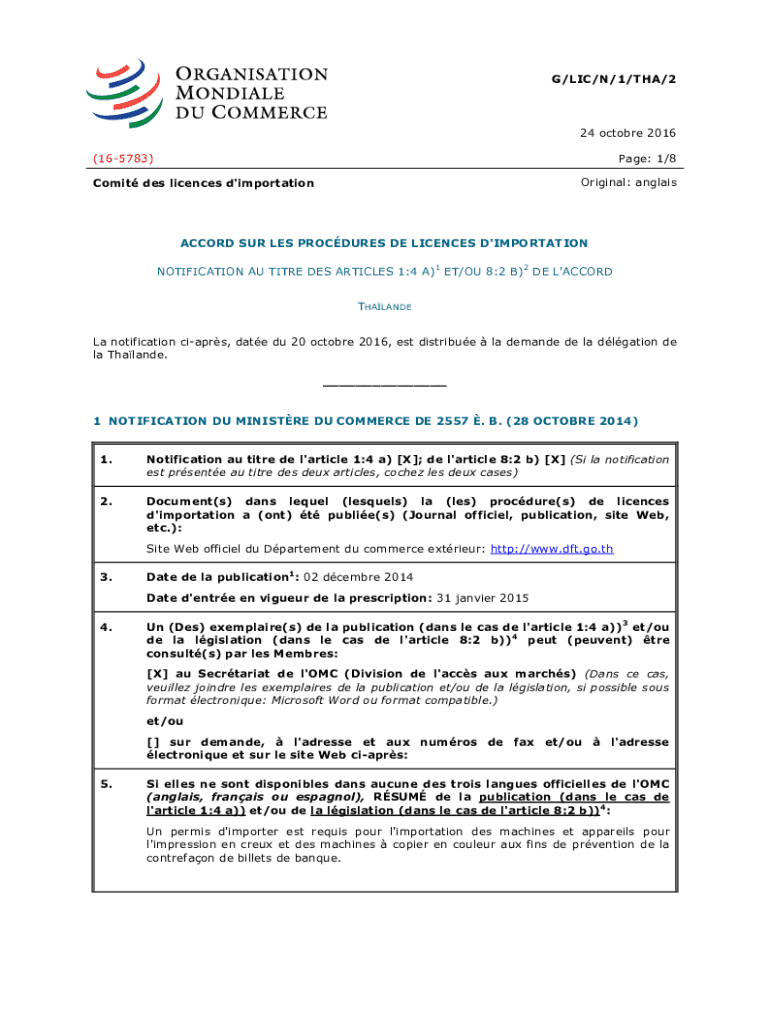G×LIC×N/1×THA×224 October 2016 ×165783)Page: 1×8 Original: anglaisComit DES licenses d\'importationACCORD SUR LES PROCEDURES DE Licenses D\'IMPORTATION NOTIFICATION AU TITLE DES ARTICLES 1:4