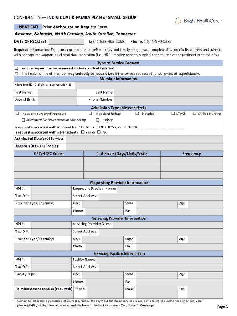 CONFIDENTIAL INDIVIDUAL & FAMILY PLAN or SMALL GROUP INPATIENT Prior Authorization Request Form Alabama, Nebraska, North Carolina, South Carolina, Tennessee DATE OF REQUEST:Fax: 18339031068Phone: