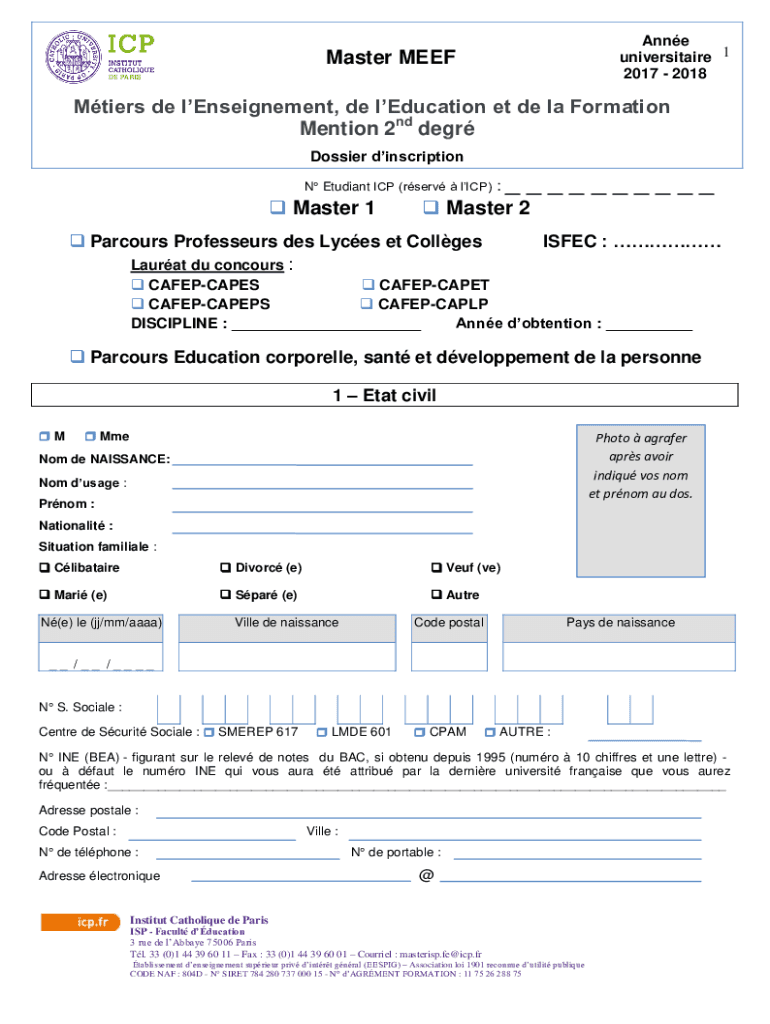Anne's universities 1 2017 2018Master Beefsteaks DE enslavement, DE education et de la Formation Mention 2nd deer Dossier inscription N Student ICP (serve lip) Master 1:___ Master 2 IS FEC : Parlors