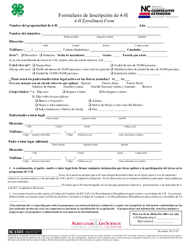 Formulation de Inscripcin de 4H Enrollment Form Hombre Del group×unidad de 4H: ___ ___ AO: ___ Hombre Del member: ___ Primer nombreSegundo nombreApellidoDireccin: ___ CalleCiudadEstadoCdigo postalTelfono: