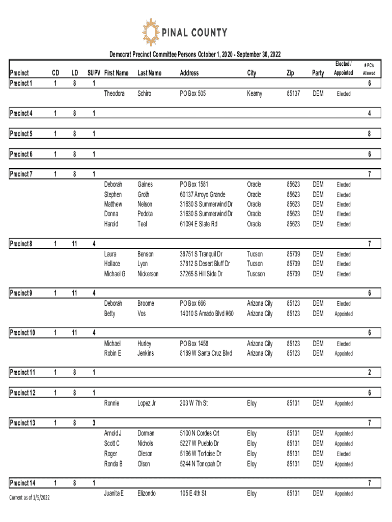 Democrat Precinct Committee Persons October 1, 2020, September 30, 2022, Precinct 1CD 1LD 8SUPV First Name 1 Theodorakis NameAddressCityZipPartyElected / AppointedSchiroPO Box 505Kearny85137DEMElected#