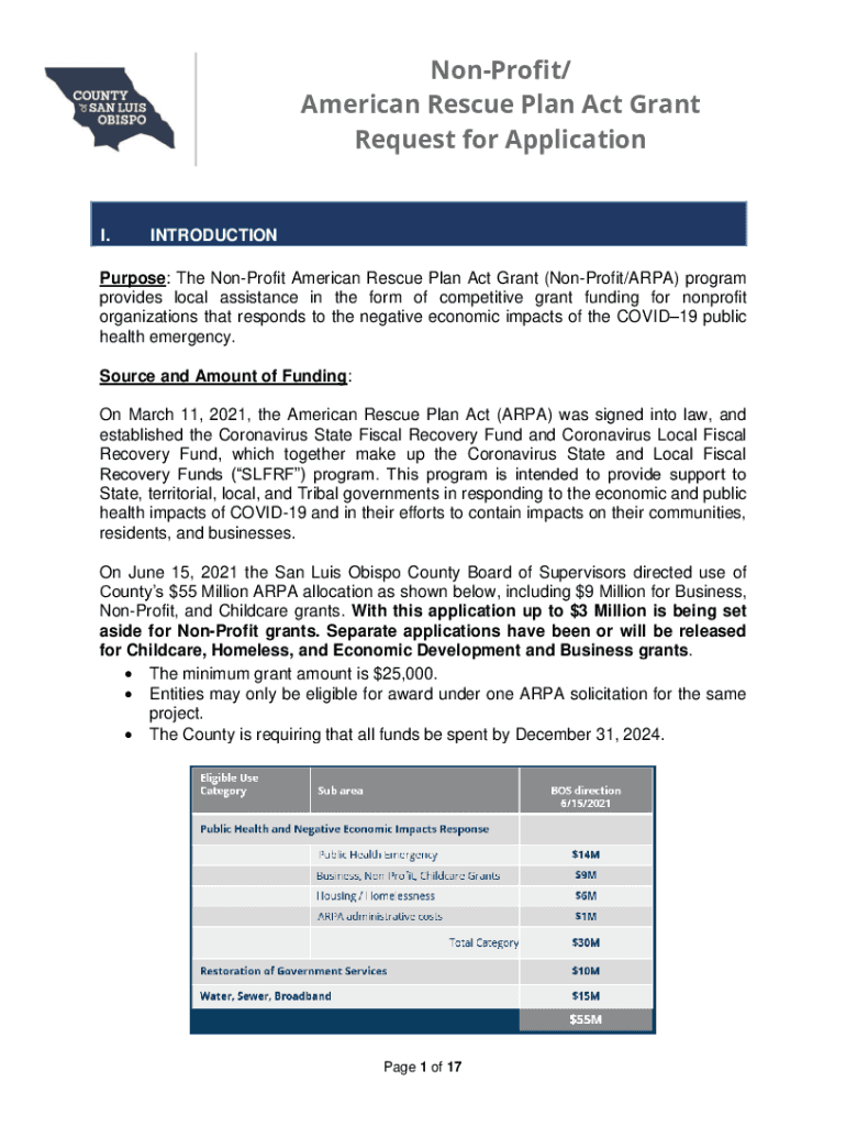 Nonprofit/ American Rescue Plan Act Grant Request for Application Luis Obis I.INTRODUCTIONPurpose: The Nonprofit American Rescue Plan Act Grant (Nonprofit×ARPA) program provides local assistance