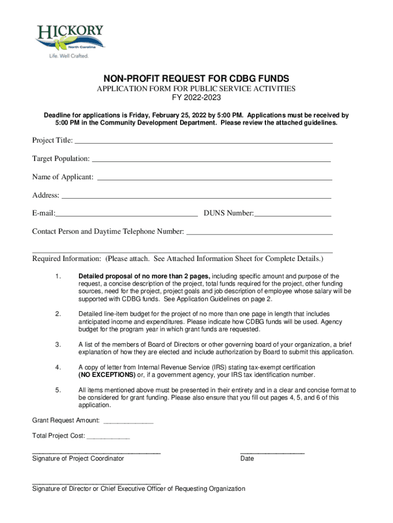 NONPROFIT REQUEST FOR CBG FUNDS APPLICATION FORM FOR PUBLIC SERVICE ACTIVITIES FY 20222023 Deadline for applications is Friday, February 25, 2022, by 5:00 PM. Applications must be received by 5:00