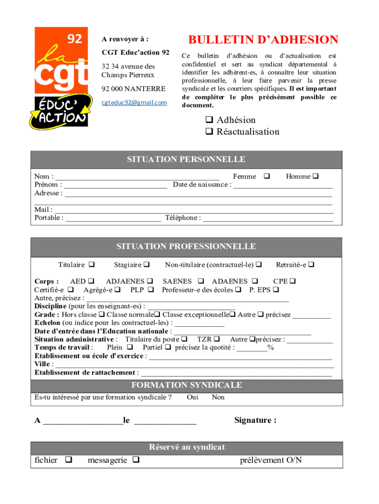 Get the free BULLETIN D'ADHESION - CGT duc'action 92