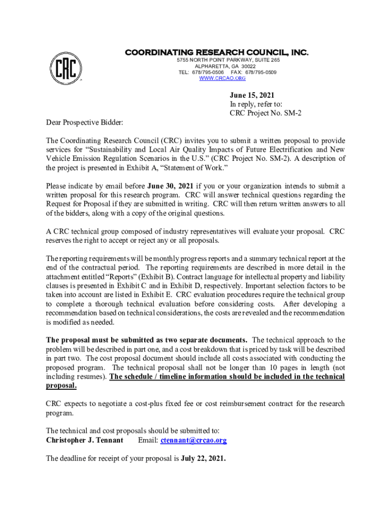 COORDINATING RESEARCH COUNCIL, INC. 5755 NORTH POINT PARKWAY, SUITE 265 ALPHARETTA, GA 30022 TEL: 678×7950506 FAX: 678×7950509 WWW.CACAO. Order Prospective Bidder:June 15, 2022, In reply, refer