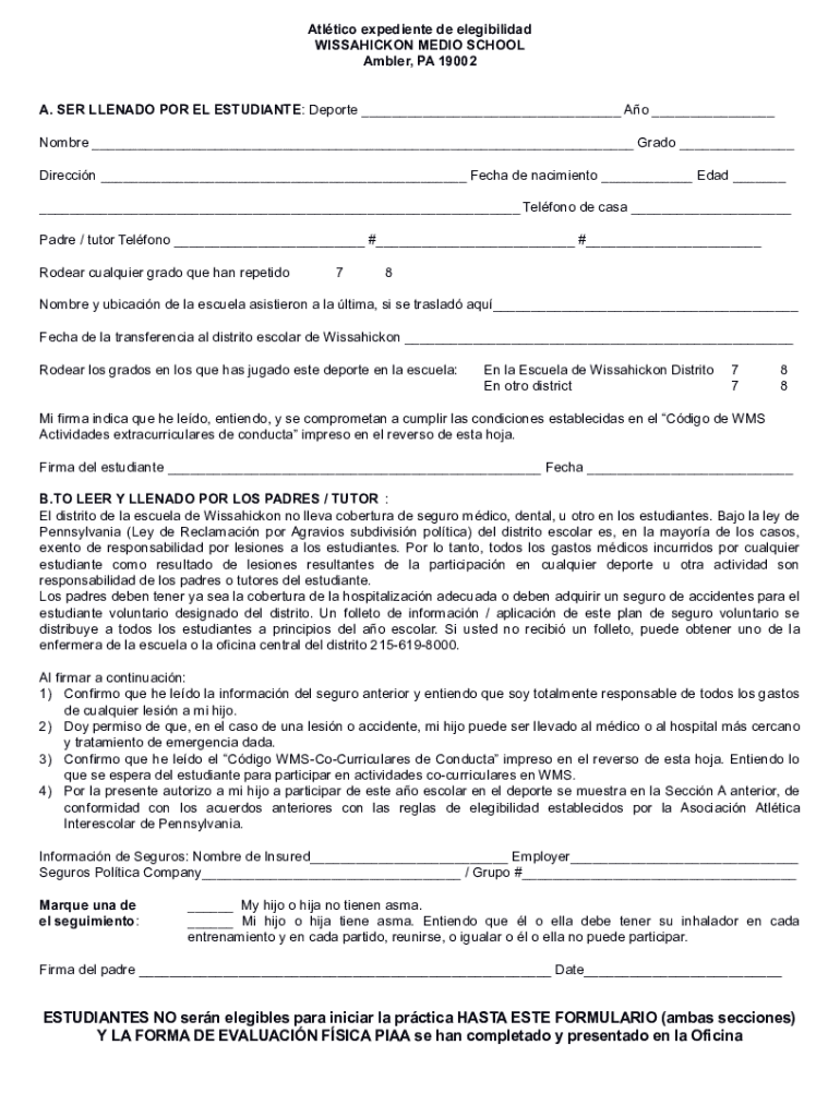 Atlético expedient de elegibilidad WISSAHICKON MEDIA SCHOOL Ambler, PA 19002 A. SER LENDDO POR EL ESTUDIANTE: Deported ___ AO ___ Hombre ___ Grade ___ Direction ___ Tech de Nascimento ___ Dad ___