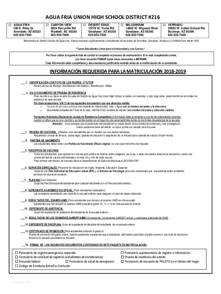 Este formulario es para padres o tutores legales que desean inscribir a sus hijos en el Agua Fria Union High School District. Es importante tener en cuenta que se requiere la firma del padre o del tutor legal.