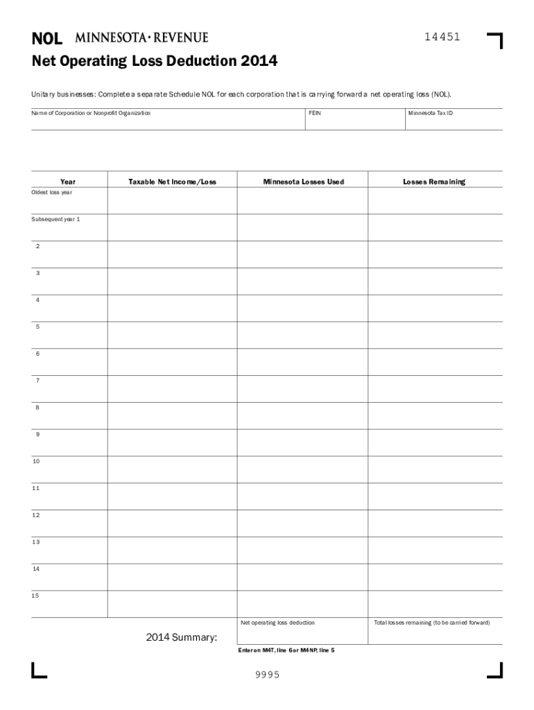 NOL14451Net Operating Loss Deduction 2014Unitary businesses: Complete a separate Schedule NOT for each corporation that is carrying forward a net operating loss (NOT×. Name of Corporation or Nonprofit