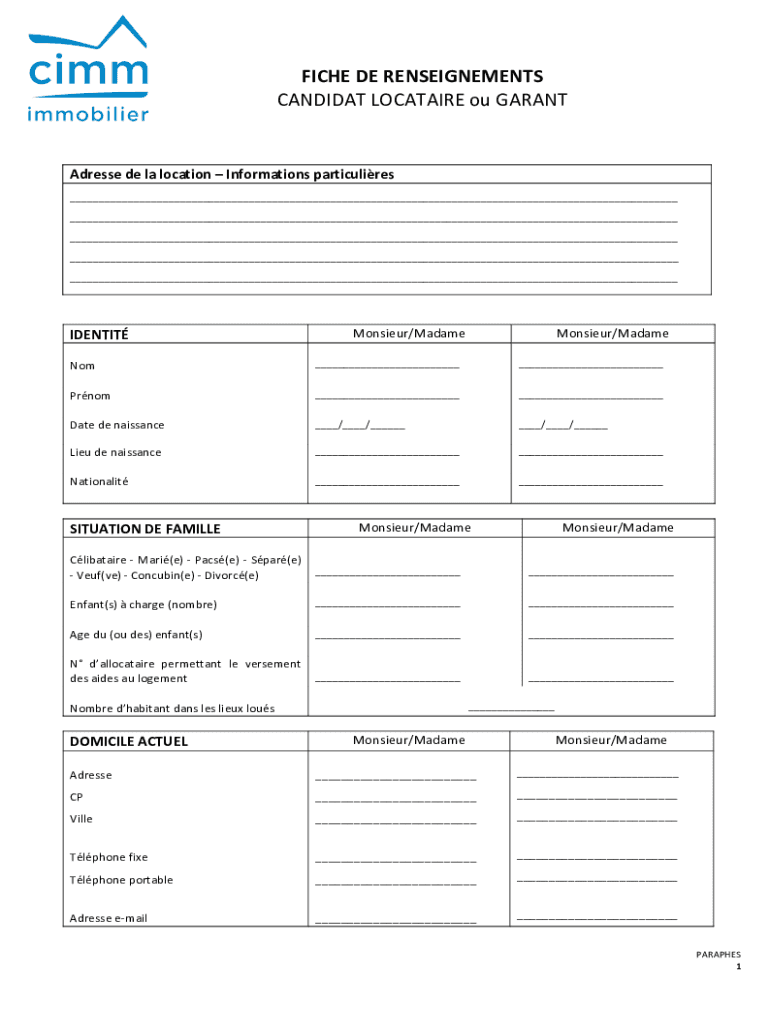 FICHE DE RENSEIGNEMENTSCANDIDAT LOCATION of GARANTAdresse de la location Information particulars___ ___ ___ ___ ___IDENTITNomPrnomDate de naissanceLieu de naissanceNationalitMonsieur×Madame Monsieur×Madame_______________/___/____________/___/_________SITUATION