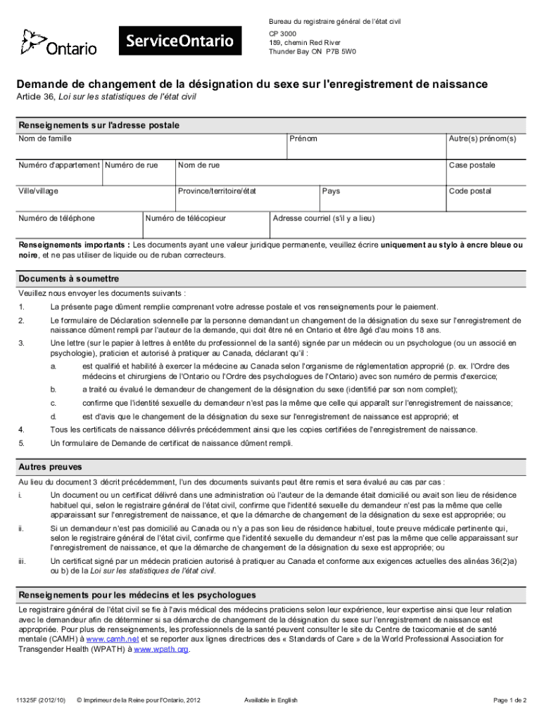 Bureau Du registered gnarl DE stat civil CP 3000 189, chem in Red River Thunder Bay ON P7B 5W0Demande de management DE la designation Du see SUR l\'enregistrement de Renaissance Article 36, LOI SUR