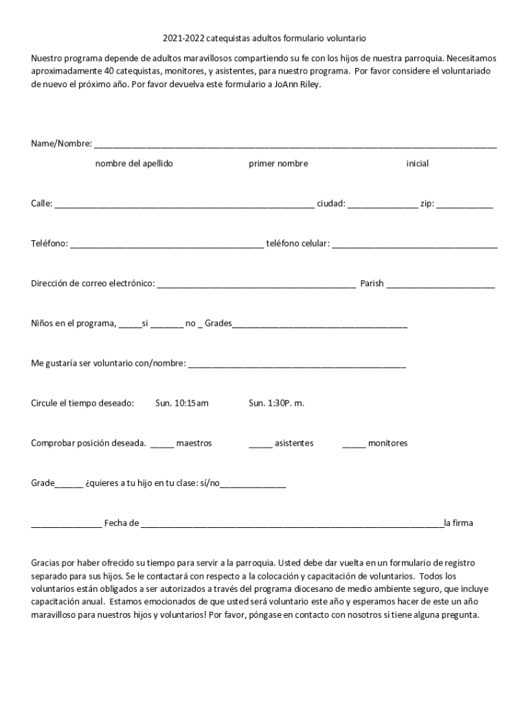 20212022catequistasadultosformulariovoluntario Nuestroprogramadependedeadultosmaravillososcompartiendosufeconloshijosdenuestraparroquia. Necessitates aproximadamente40catequistas,monitors, yasistentes,