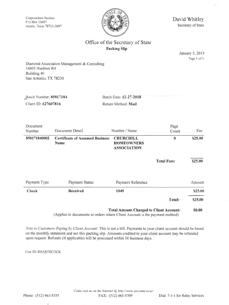 Corporations Section P.O. Box 13697 Austin. Texas 7871 I3697David Whitley Secretary of StateOffice of the Secretary of State Packing Slip January 3,2019, Page I of Diamond Association Management &