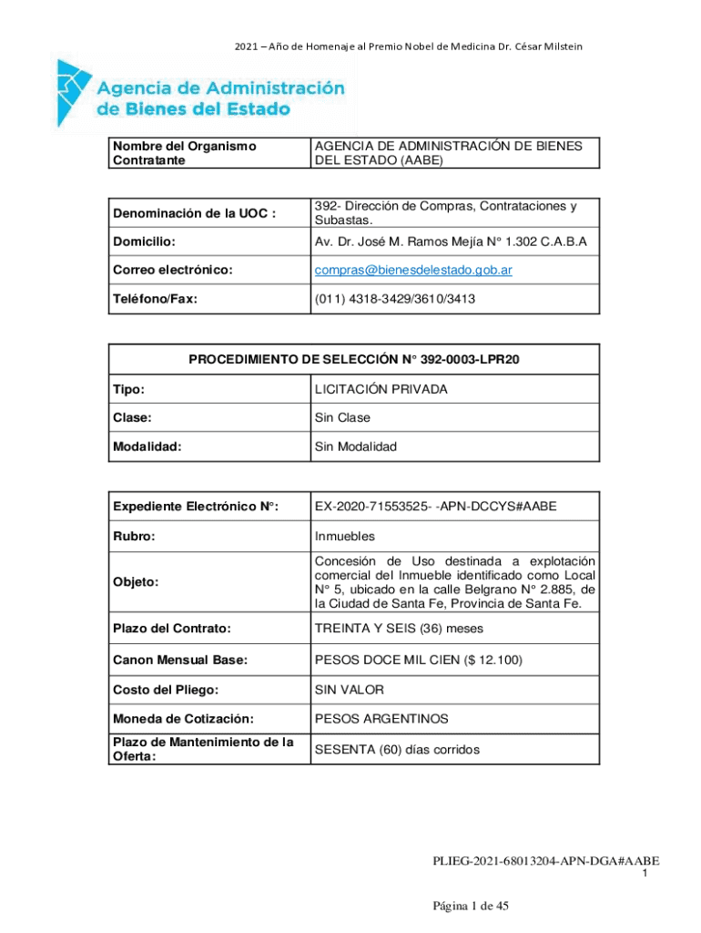 2021 AO de Homenaje all Premix Nobel de Medicina Dr. CSAR MilsteinNombre Del Organism ContratanteAGENCIA DE ADMINISTRATION DE LINES DEL ESTATE (ABE×Denomination de la IOC :392 Direction de Compras,