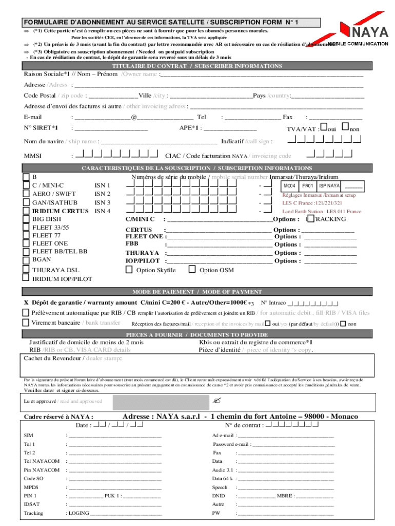 FORMULA IRE ATONEMENT AU SERVICE SATELLITE / SUBSCRIPTION FORM N 1 (*1) Bette parties nest repair of CES pics né sent Fournier Que pour LES bonds personnel morals. Pour LES soc its CEE, en absence