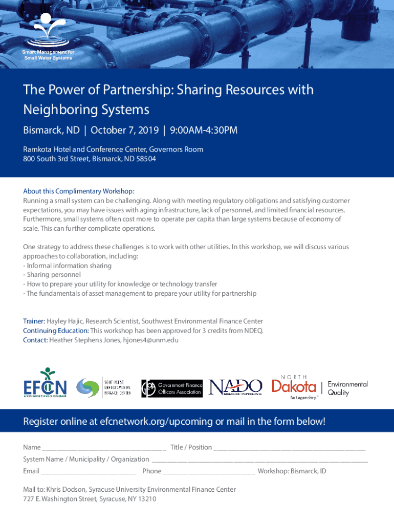 The Power of Partnership: Sharing Resources with Neighboring Systems Bismarck, ND | October 7, 2019 × 9:00AM4:30PM Dakota Hotel and Conference Center, Governors Room 800 South 3rd Street, Bismarck,