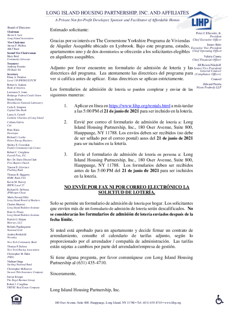 LONG ISLAND HOUSING PARTNERSHIP, INC. AND AFFILIATES A Private NotforProfit Developer, Sponsor and Facilitator of Affordable Homes Board of Directors Chairman Kevin S. Law Long Island Association
