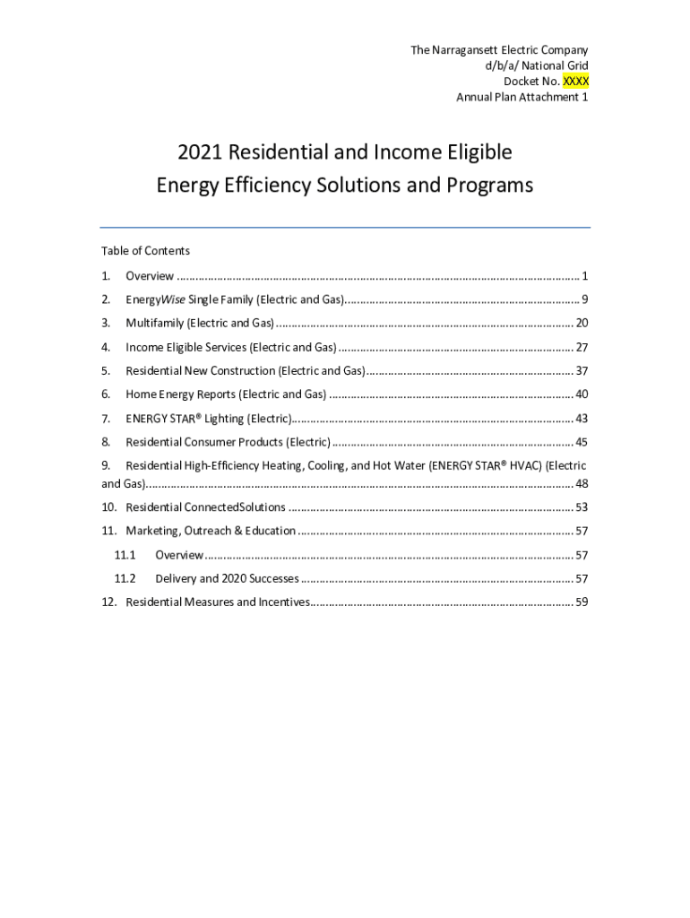 The Narragansett Electric Company d×b/a/ National Grid Docket No. XXX Annual Plan Attachment 12021 Residential and Income Eligible Energy Efficiency Solutions and Programs Table of Contents 1. Overview