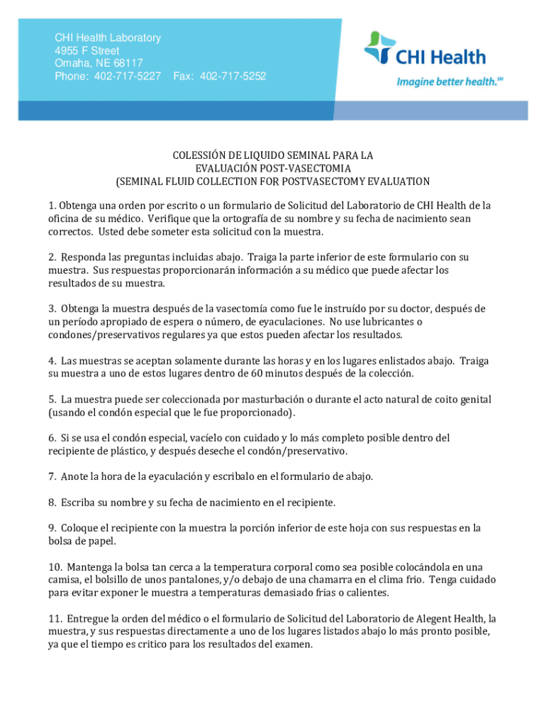 CHI Health Laboratory 4955 F Street Omaha, NE 68117 Phone: 4027175227Fax: 4027175252COLESSIN DE LIQUID SEMINAL PARA LA EVALUATION POSTVASECTOMIA (SEMINAL FLUID COLLECTION FOR POSTVASECTOMY EVALUATION