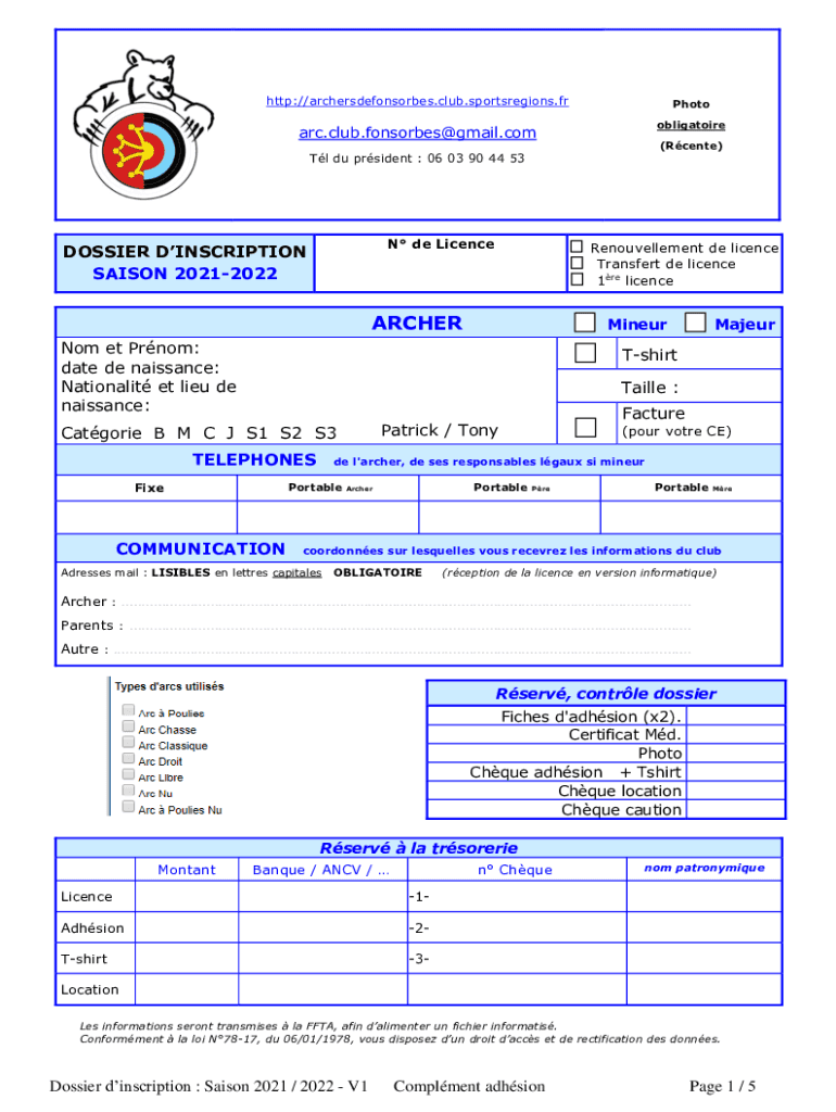 HTTP://archersdefonsorbes.club.sports regions.frPhotoarc.club. Forbes×Gmail.comobligatoire (Center×Tl Du president : 06 03 90 44 53 N de LicenceDOSSIER INSCRIPTION SAIGON 20212022Renouvellement