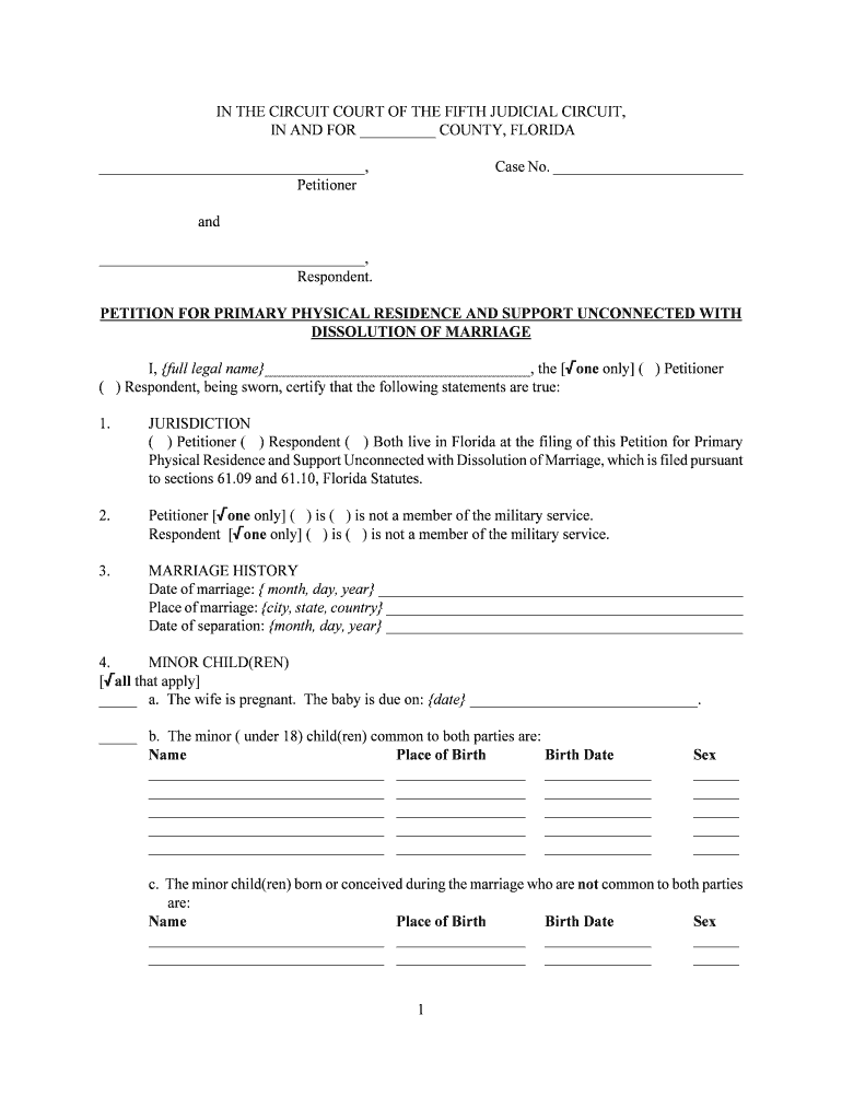 IN THE CIRCUIT COURT OF THE FIFTH JUDICIAL CIRCUIT, IN AND FOR COUNTY, FLORIDA, Petitioner Case No. and, Respondent. PETITION FOR PRIMARY PHYSICAL RESIDENCE AND SUPPORT UNCONNECTED WITH DISSOLUTION