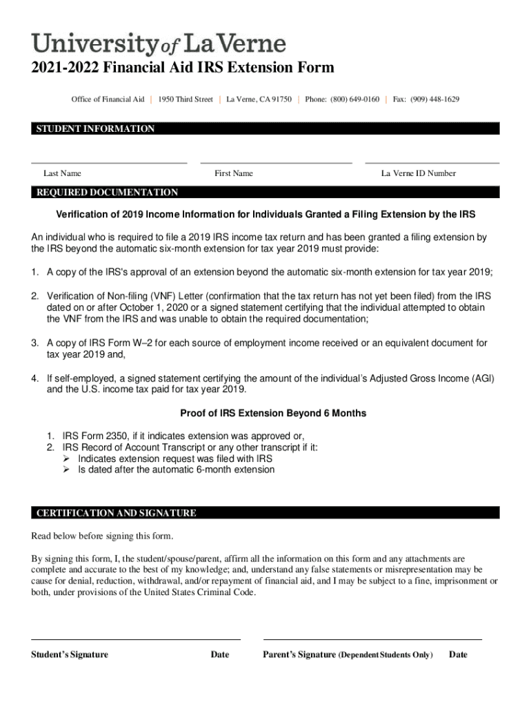 20212022 Financial Aid IRS Extension Form Offices of Financial Aid | 1950 Third Street | La Verne, CA 91750 | Phone: (800× 6490160 | Fax: (909) 4481629STUDENT Informational NameFirst Namely Verne