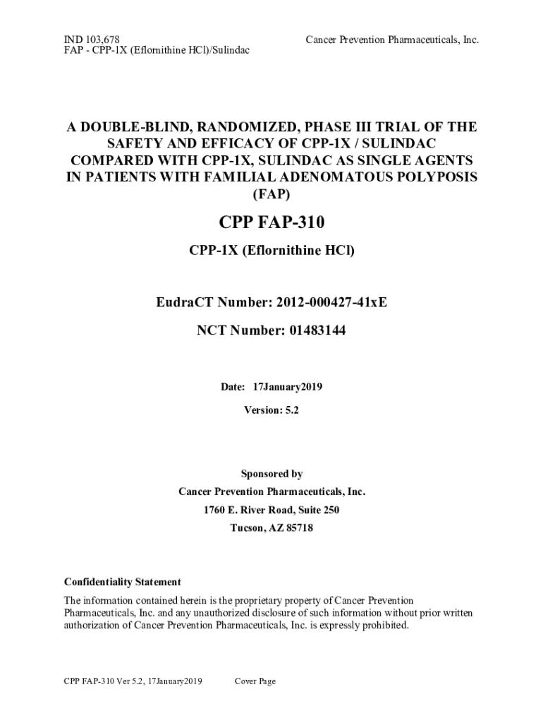 IND 103,678 FAP CPP1X (HCl)/SulindacCancer Prevention Pharmaceuticals, Inc. A DoubleClick, RANDOMIZED, PHASE III TRIAL OF THE SAFETY AND EFFICACY OF CPP1X / COMPARED WITH CPP1X, AS SINGLE AGENTS IN