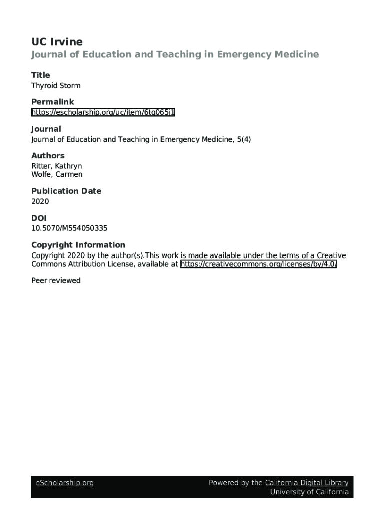 UC Irvine Journal of Education and Teaching in Emergency Medicine Title Thyroid StormPermalink HTTPS://scholarship.org×UC×item×6tq065j1Journal Journal of Education and Teaching in Emergency Medicine,