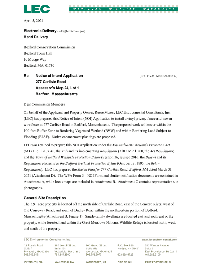 April 5, 2022, Electronic Delivery (side×Bedford.gov) Hand Delivery Bedford Conservation Commission Bedford Town Hall 10 Judge Way Bedford, MA 01730 Re:Notice of Intent Application×LEC File #: MozR21082.02×277