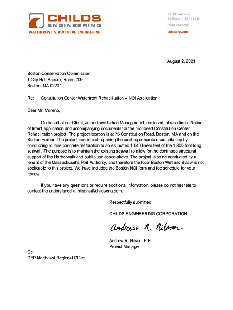 34 William Way Bellingham, MA 02019 ×508× 966 9092 children.com August 2, 2021, Boston Conservation Commission 1 City Hall Square, Room 709 Boston, MA 02201 Re:Constitution Center Waterfront Rehabilitation