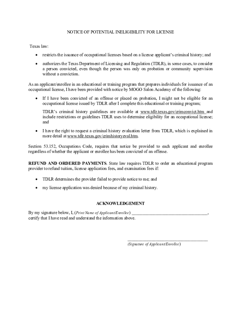 Get the free NOTICE OF POTENTIAL INELIGIBILITY FOR LICENSE Texas law